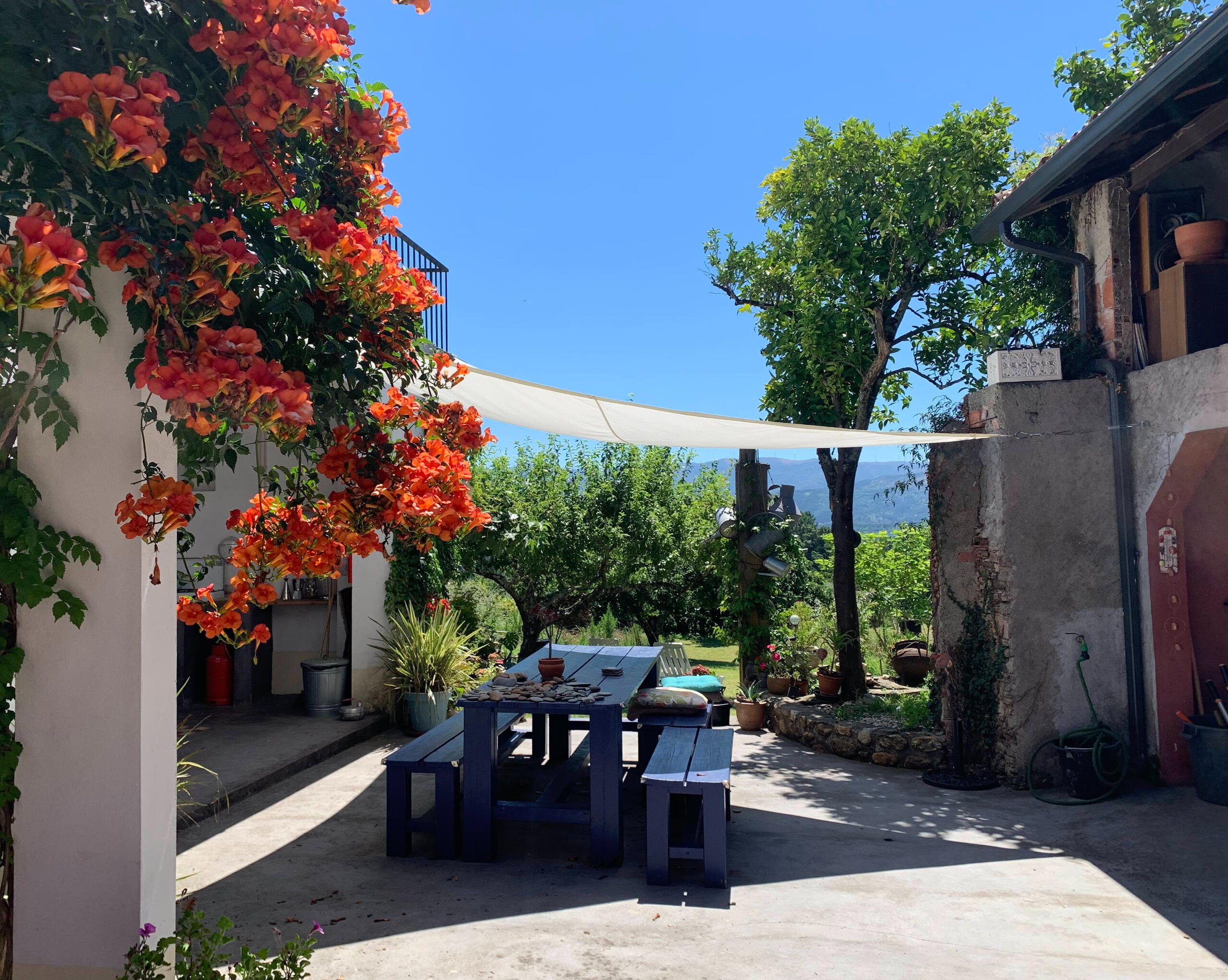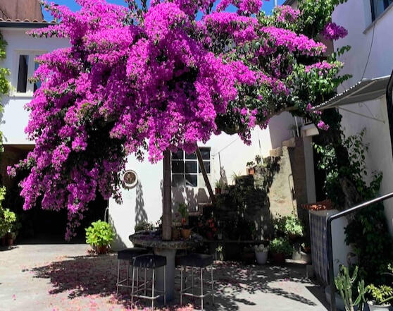 The guesthouse has two units for rent centered around a spacious courtyard, featuring an original olive press and bread oven, and a majestic magenta bougainvillea tree proudly displaying its vibrant colour.